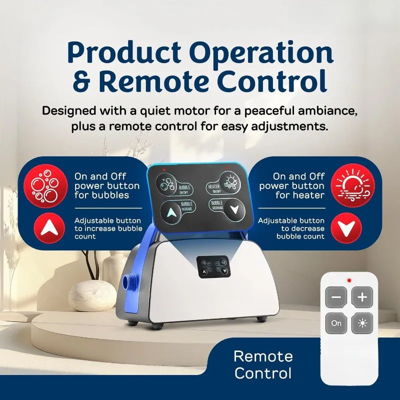Engineered for safety and comfort, this mat stays securely in place, even in active baths, thanks to its non-slip, water-resistant surface. The heater maintains a warm, soothing bath, while the motorized air pump creates gentle to vigorous bubbles for a spa-like experience at home. The included remote makes it easy to switch modes, adjust speed, and power on/off from anywhere in the tub.