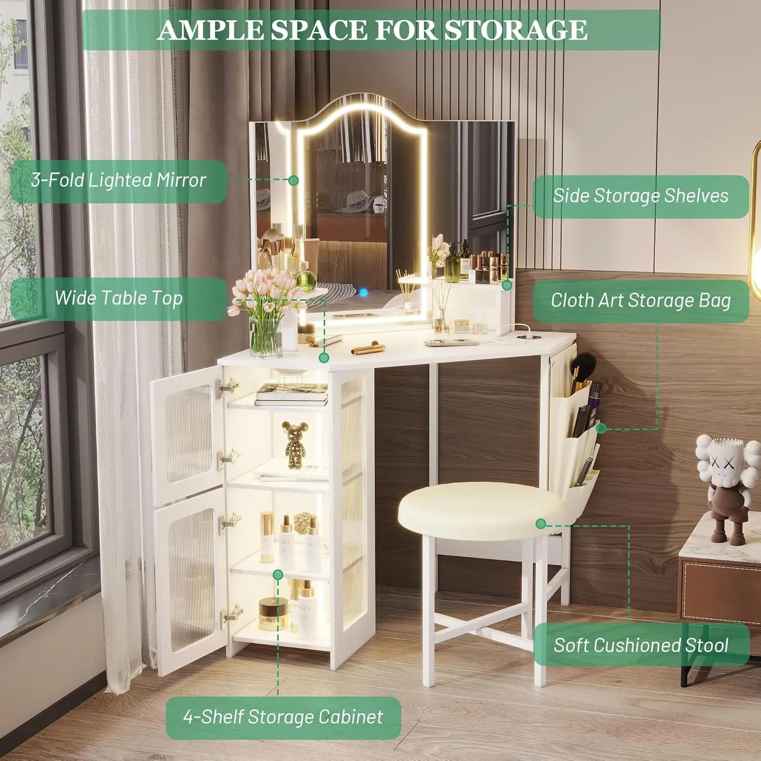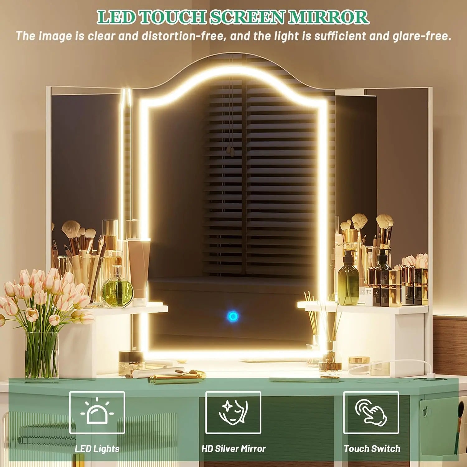Meet the White Vanity Desk With Lighted Mirror And Charging Station—where chic design meets everyday practicality. Finished in pristine white, this makeup table features a bright LED mirror, a built-in charging dock, and smart storage that keeps cosmetics, tools, and accessories neatly organized for effortless beauty routines.